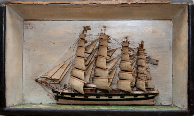 Vorig jaar kreeg ik uit de nalatenschap van een tante dit scheepsmodel. Het is ooit eigendom geweest van een oudoom van mijn vader. Hij heeft het als souvenir van één van zijn reizen meegenomen, of misschien ook nog wel zelf gemaakt.